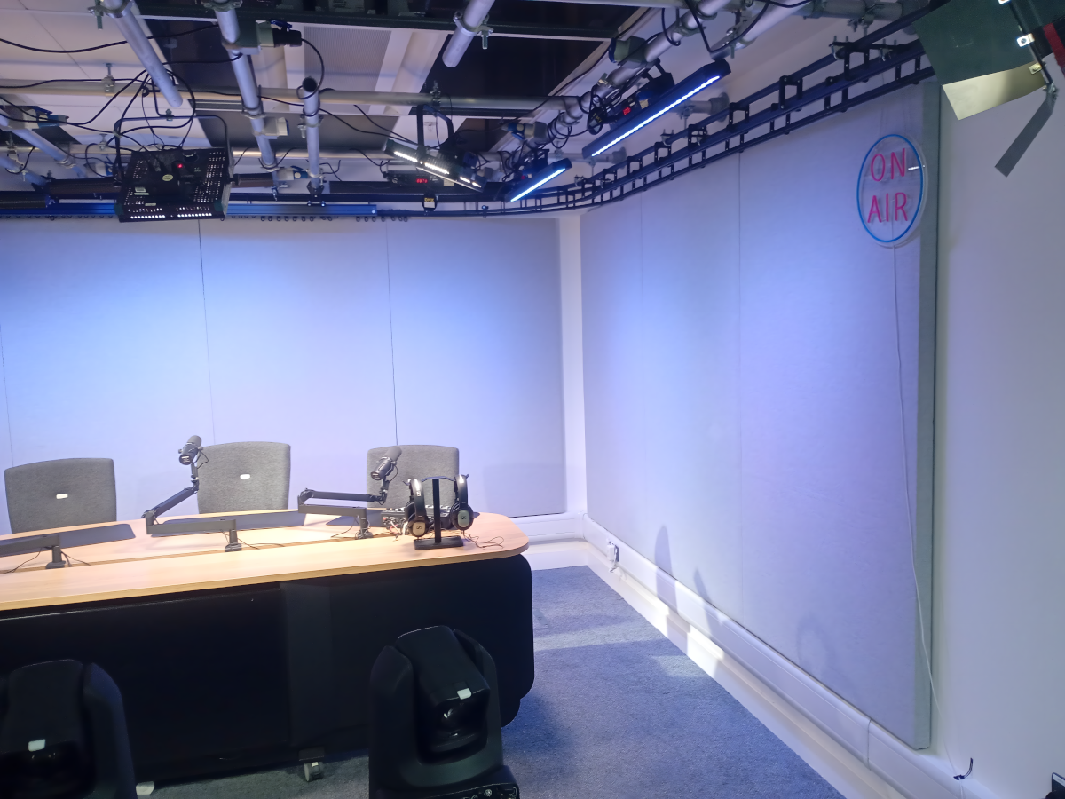 Toteutimme Sheffieldin yliopistolle akustiikkaratkaisun Media Suite -tilaan, jota käytetään podcastien ja muun äänisisällön tallentamiseen. Projektiin sisältyi seinään asennettavia Hush akustiikkapaneeleita sekä siirreltäviä HushWall seinäkkeitä, joilla parannettiin tilan äänenlaatua ja vähennettiin kaikua. Kiinteiden ja liikuteltavien akustiikkaratkaisujen yhdistelmä mahdollistaa tilan joustavan muokkaamisen eri käyttötarpeisiin säilyttäen miellyttävän ja hallitun akustiikan.