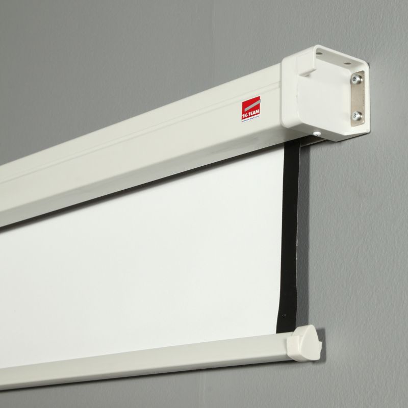 High-quality matt white three-layer screen for all applications. Manual projection screens can be installed directly to the wall, ceiling or brackets. Hanging loops are included for hooks or rails. The viewing angle is 120’ and the reflection coefficient is 1.0, white steel enclosure. Our range includes different types of wall and ceiling brackets for projection screens. See accessories for details.