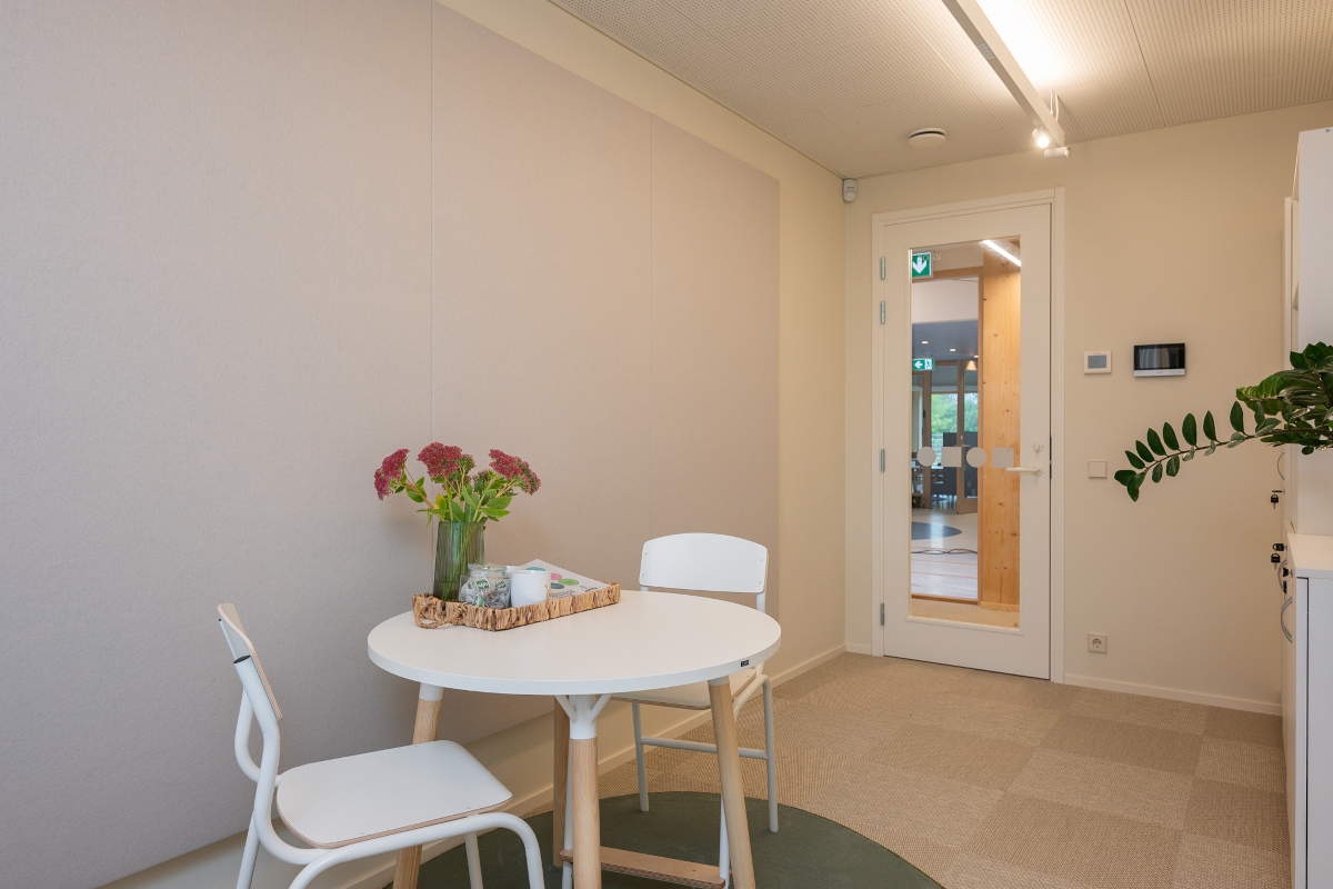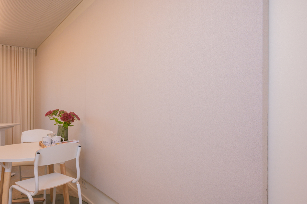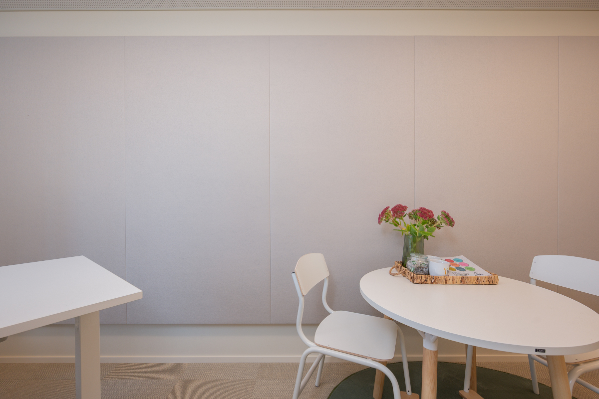 Rauhallisen harmaat seinäpaneelit tuovat visuaalista tasapainoa ja lisäävät tilan pehmeyttä sekä akustisesti että esteettisesti. Kaikki paneelit on verhoiltu 100 % luonnonvillaisella Gabriel Soul -kankaalla, joka takaa pitkäikäisen laadun ja kestävyyden.