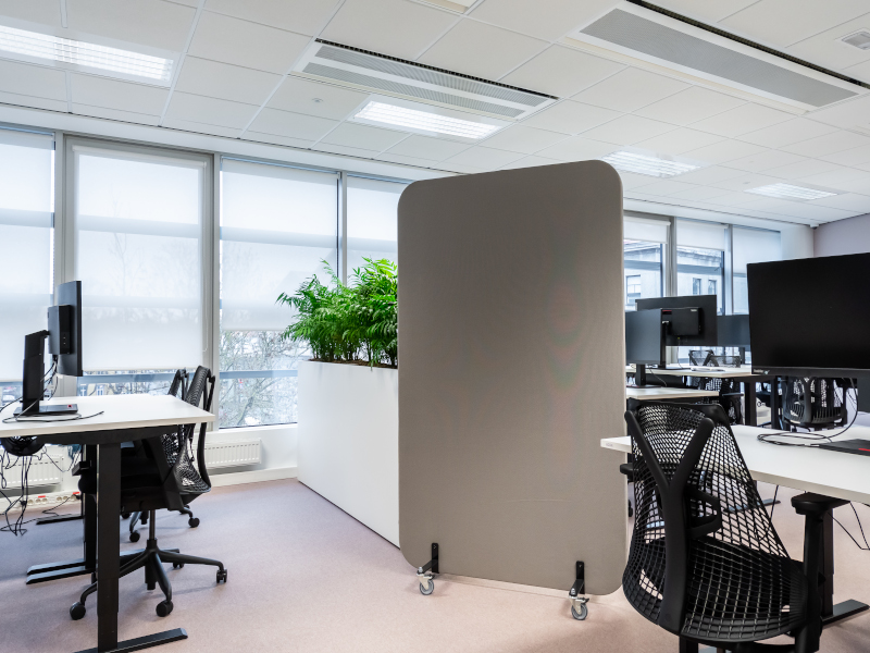 Asiakas valitsi Hush Wall -liikuteltavat akustiset tilanjakajat toimistoonsa, jotka oli päällystetty ylellisellä Camira Caran kankaalla Shetland EJ191 -värisävyssä. Hush Wall on akustinen tilanjakaja, jolla on A-luokan ominaisuudet. Hush Wall vähentää tehokkaasti ääniä. Pyörien ansiosta Hush Wall on helppo ja kätevä siirtää.
